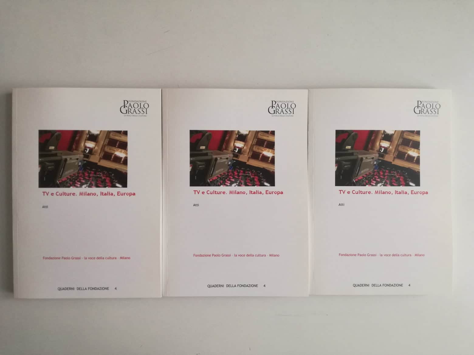 - Quarto Quaderno Atti del Convegno TV e culture. Milano, Italia, Europa in questo volume sono raccolti gli Atti dei Convegni Televisioni e culture (novembre 2013) e La RAI e Milano (giugno 2014) stampato a cura della Fondazione Paolo Grassi-La voce della cultura – dicembre 2014